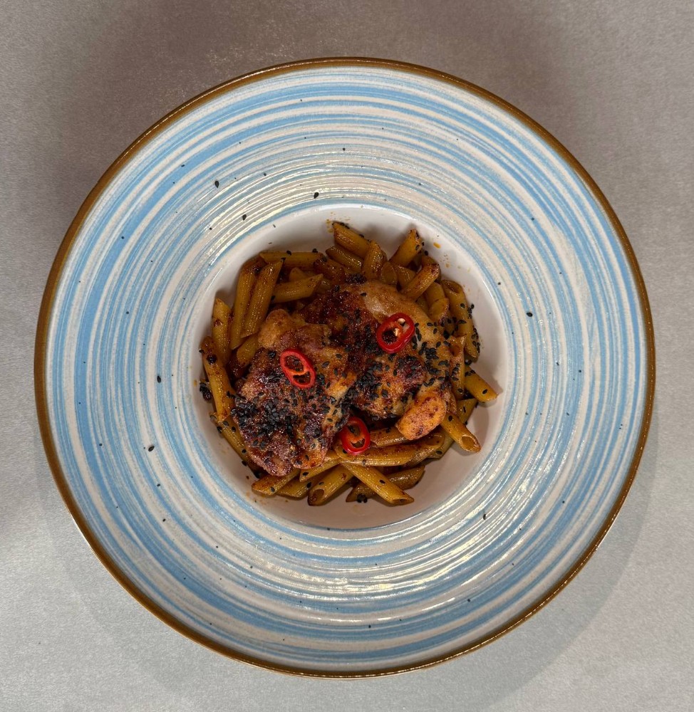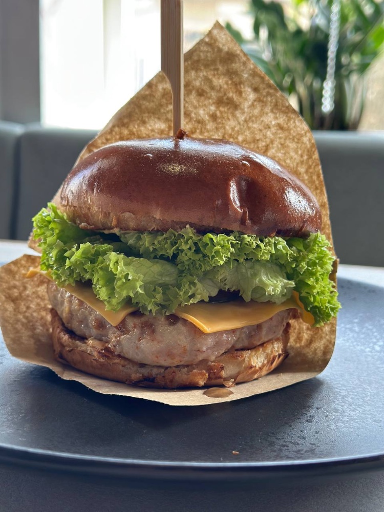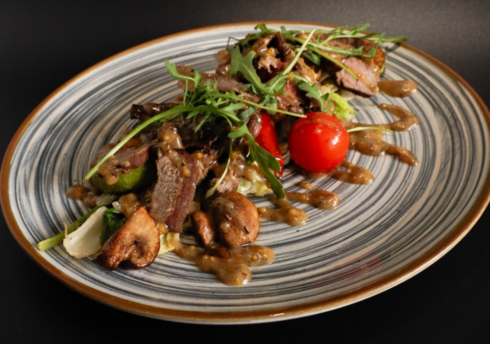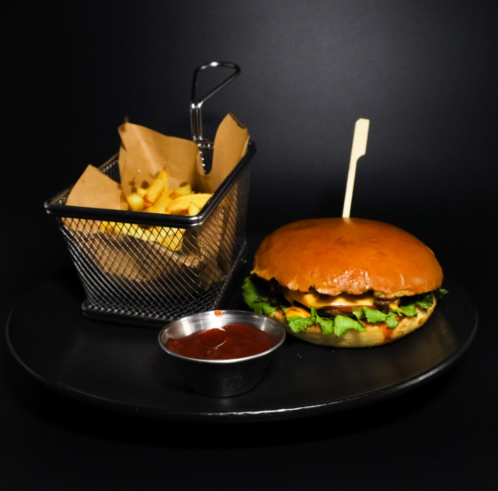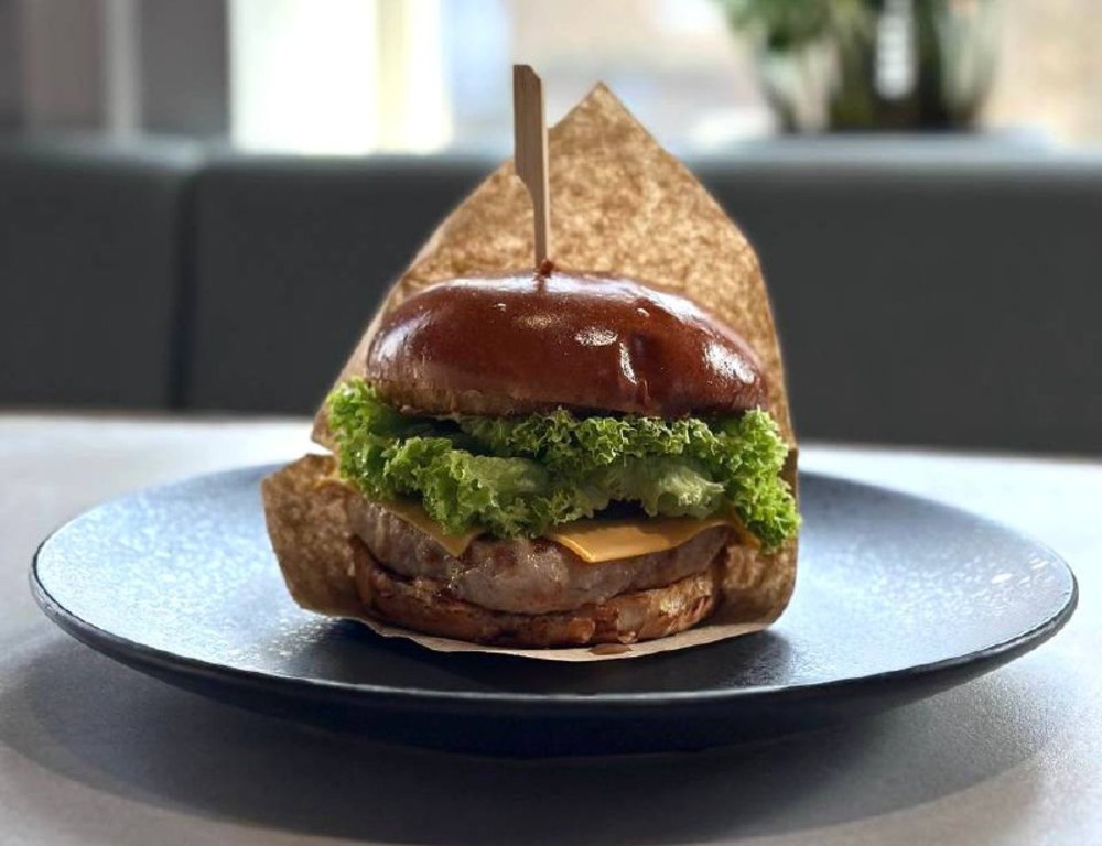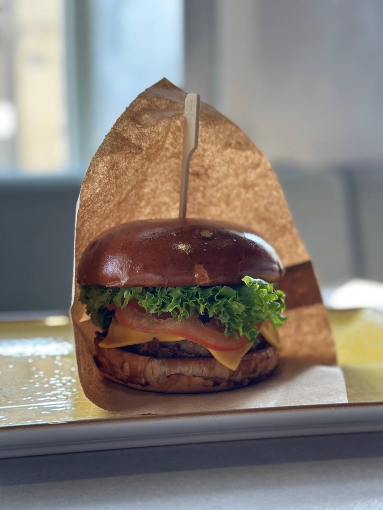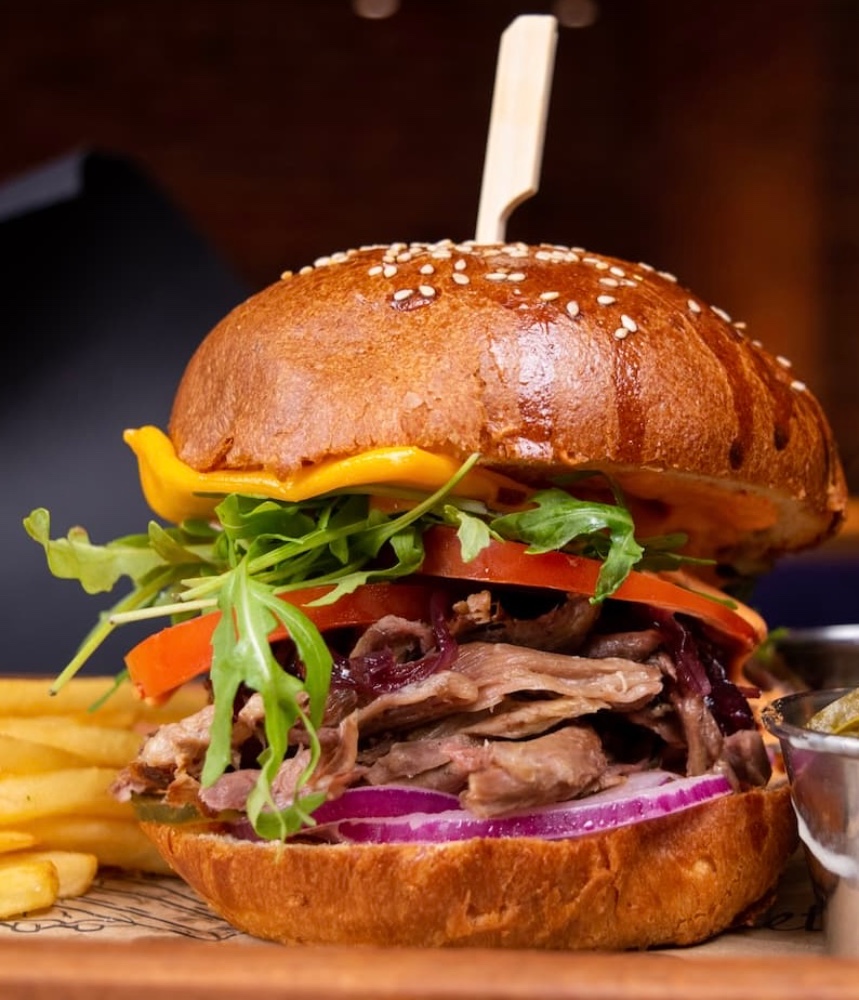 Бургер з ростбіфом,мармеладною цибулею та сирним соусом