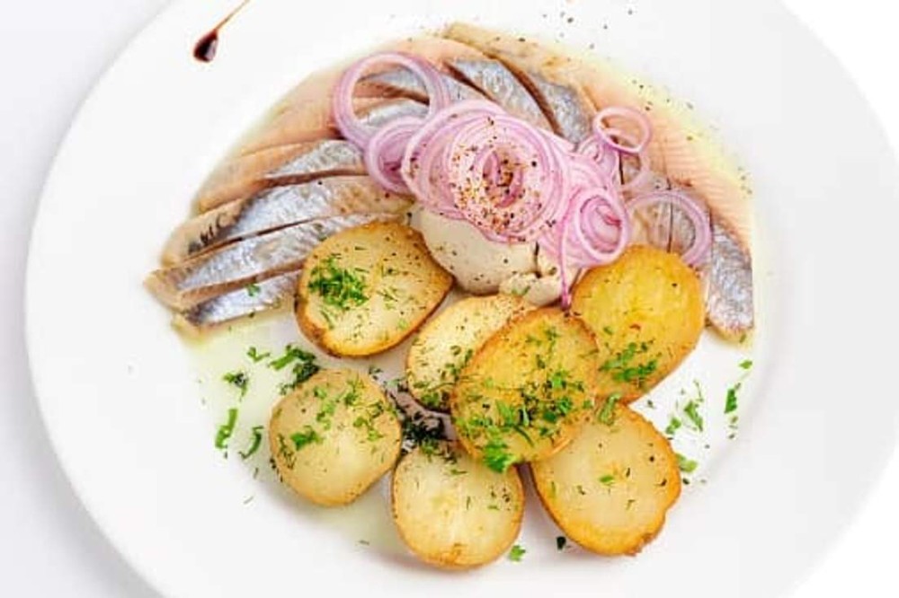 Закусочна тарілка з оселедцем, смаженою картоплею, квашеною капусточкою та маринованою цибулею
